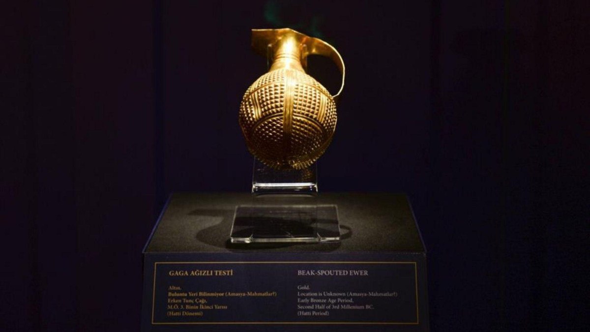 26 Ekim 2022'de Türkiye'ye iadesi sağlanan 4 bin 250 yıllık altın testi, Ankara Anadolu Medeniyetleri Müzesi'nde sergileniyor.